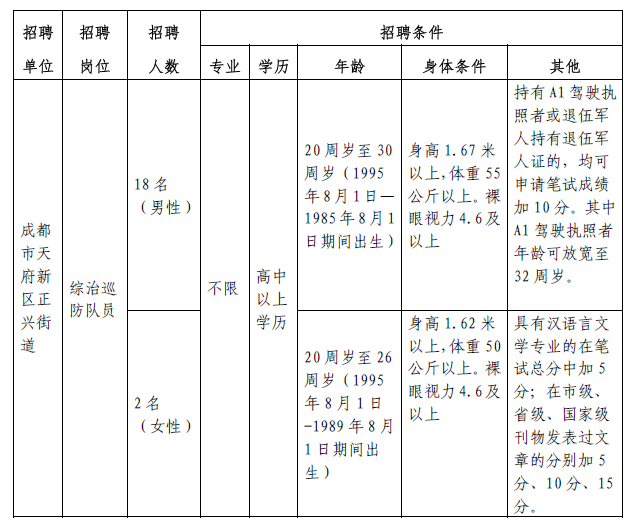 成都天府新區(qū)雙流人才服務(wù)有限公司于2015年8月7日發(fā)布了《關(guān)于成都天府新區(qū)正興街道派遣制工作人員招聘的公告》。現(xiàn)因綜治巡防隊(duì)員崗位符合報(bào)名條件的報(bào)考人數(shù)較少,未達(dá)到開考比例,經(jīng)用人單位研究決定,對關(guān)于成都天府新區(qū)正興街道派遣制工作人員招聘的公告內(nèi)容進(jìn)行部分調(diào)整,調(diào)整內(nèi)容如下: