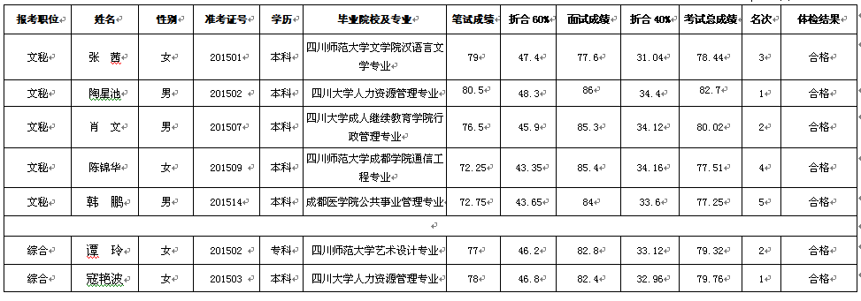 樂至縣2015年公開招聘事業(yè)單位工作人員(A類崗位)面試成績及總成績排名的公示