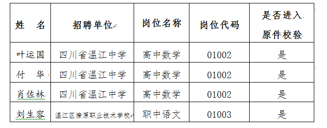 附件:2015年溫江區(qū)面向社會(huì)公開(kāi)選拔引進(jìn)副高級(jí)職稱教師進(jìn)入原件校驗(yàn)人員名單
