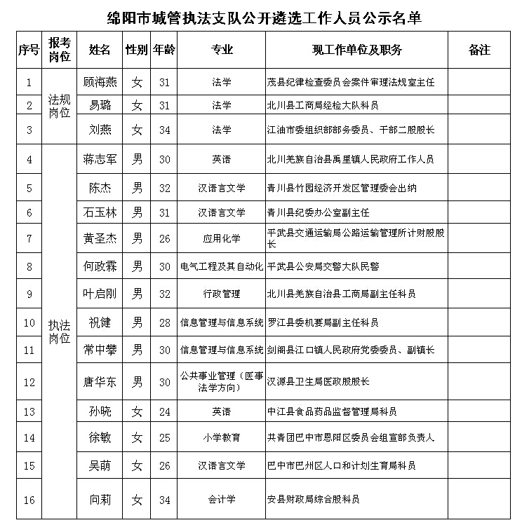 根據(jù)《綿陽市城市管理行政執(zhí)法局2014年面向全省公開遴選市城管執(zhí)法支隊工作人員的公告》,經(jīng)過報名、資格審查、初試、復(fù)試、考察和體檢,擬遴選以下16名同志(名單附后)為綿陽市城市管理行政執(zhí)法支隊工作人員,F(xiàn)面向社會予以公示。公示期為7天。在此期間如有問題舉報,請以真實姓名向綿陽市城管執(zhí)法局監(jiān)察室電話(2222637)、書面或當(dāng)面反映。