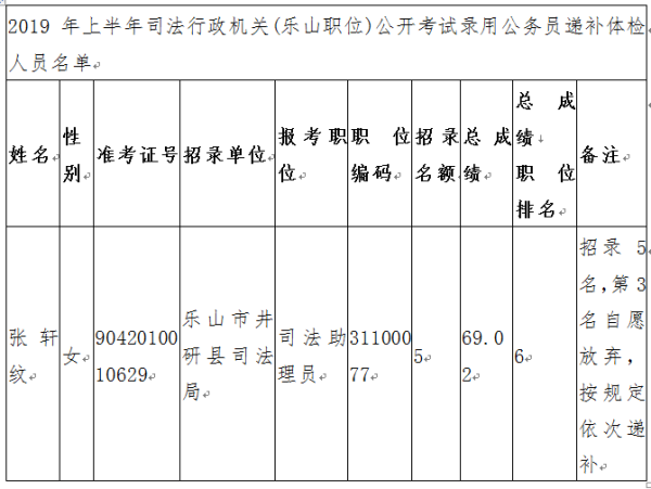 按照《中共四川省委組織部關(guān)于2019年上半年全省司法行政機(jī)關(guān)和監(jiān)獄系統(tǒng)、戒毒系統(tǒng)、司法警察訓(xùn)練總隊(duì)公開(kāi)考試錄用公務(wù)員(人民警察)的公告》、《四川省司法廳關(guān)于做好2019年上半年全省司法行政機(jī)關(guān)公開(kāi)考試錄用公務(wù)員體檢、考察、錄用工作的通知》(川司法發(fā)〔2019〕83號(hào))規(guī)定,對(duì)于自動(dòng)放棄出現(xiàn)缺額職位,在報(bào)考同一職位進(jìn)入面試的人員中依次遞補(bǔ)體檢。遞補(bǔ)體檢名單如下: