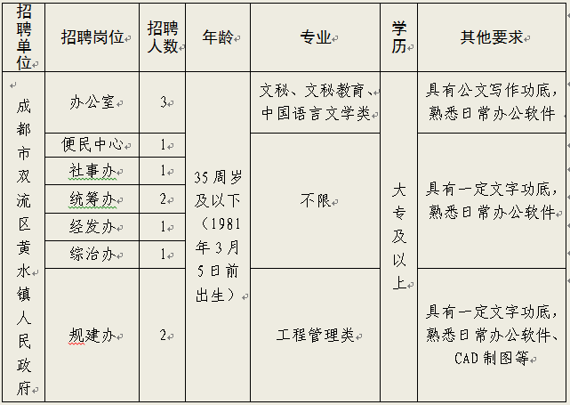 成都天府新區(qū)雙流人才服務(wù)有限公司因工作需要,現(xiàn)面向社會公開招聘派遣至成都市雙流區(qū)黃水鎮(zhèn)人民政府的工作人員11名,F(xiàn)將具體事項公告如下: