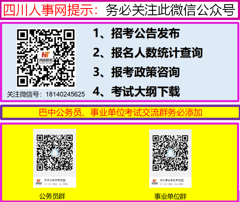 2018年四川省各個地級市聯(lián)考事業(yè)單位招考信息陸續(xù)已出,巴中招考信息也會即將發(fā)布,了解更多詳情添加以下微信或QQ群,專業(yè)老師提供報考指導和學習交流