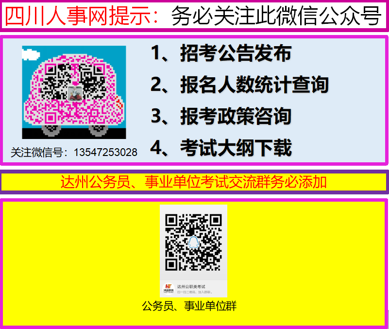 2018年四川省各個(gè)地級市聯(lián)考事業(yè)單位招考信息陸續(xù)已出,達(dá)州招考信息也會(huì)即將發(fā)布,了解更多詳情添加以下微信或QQ群,專業(yè)老師提供報(bào)考指導(dǎo)和學(xué)習(xí)交流