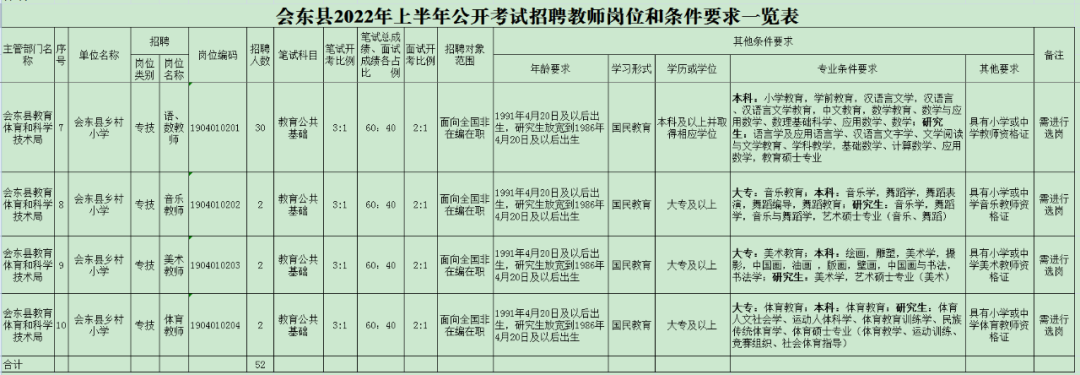 詳細(xì)情況見附件《會東縣2022年上半年公開考試招聘中小學(xué)教師崗位和條件要求一覽表》(以下簡稱《一覽表》)。